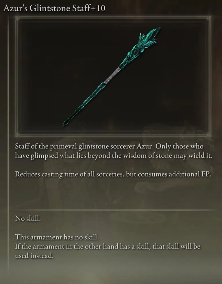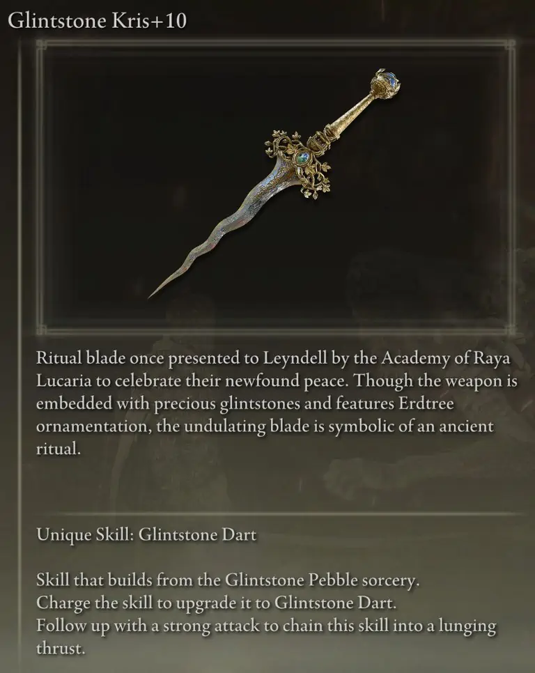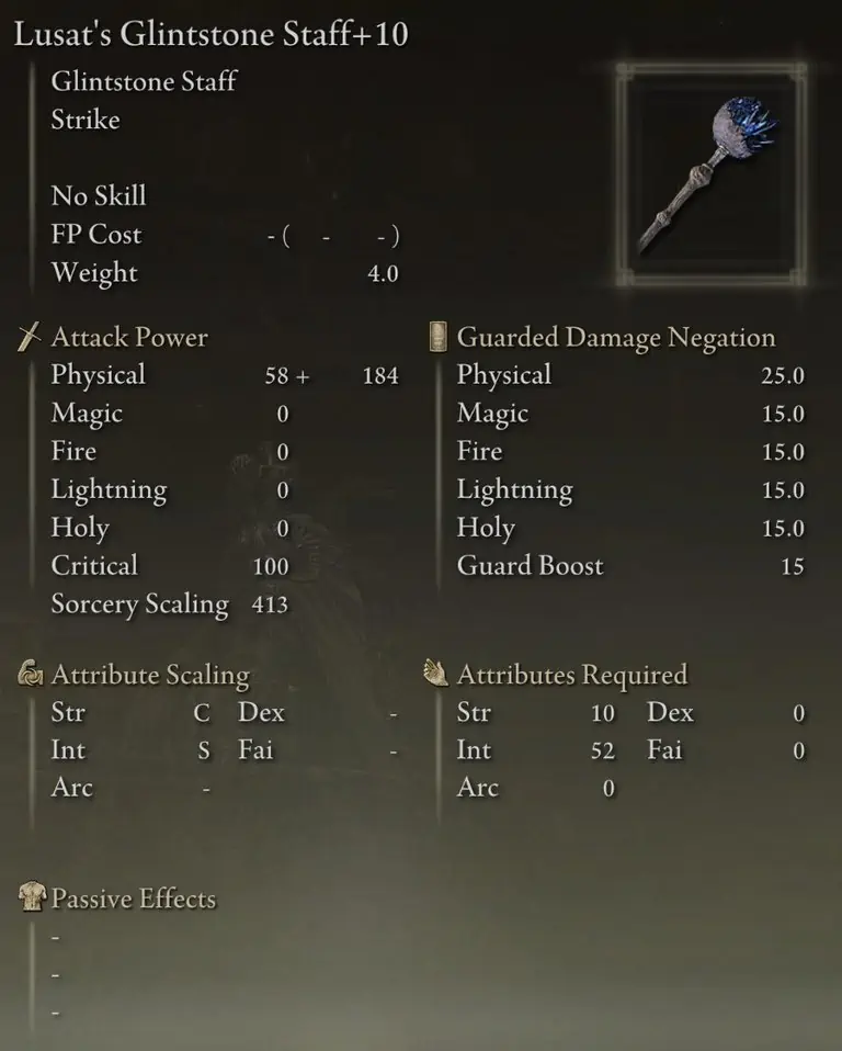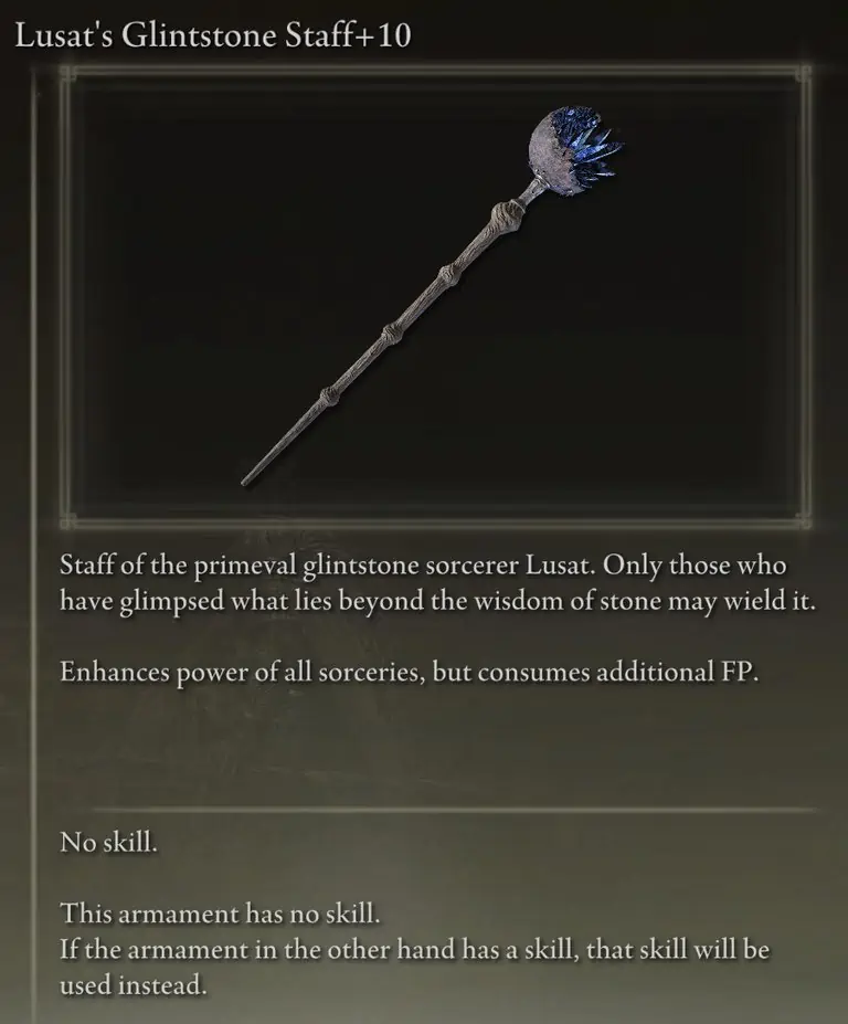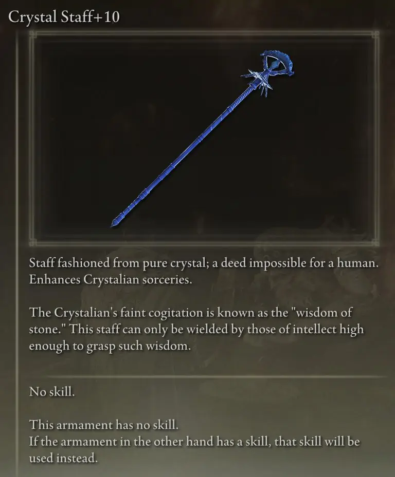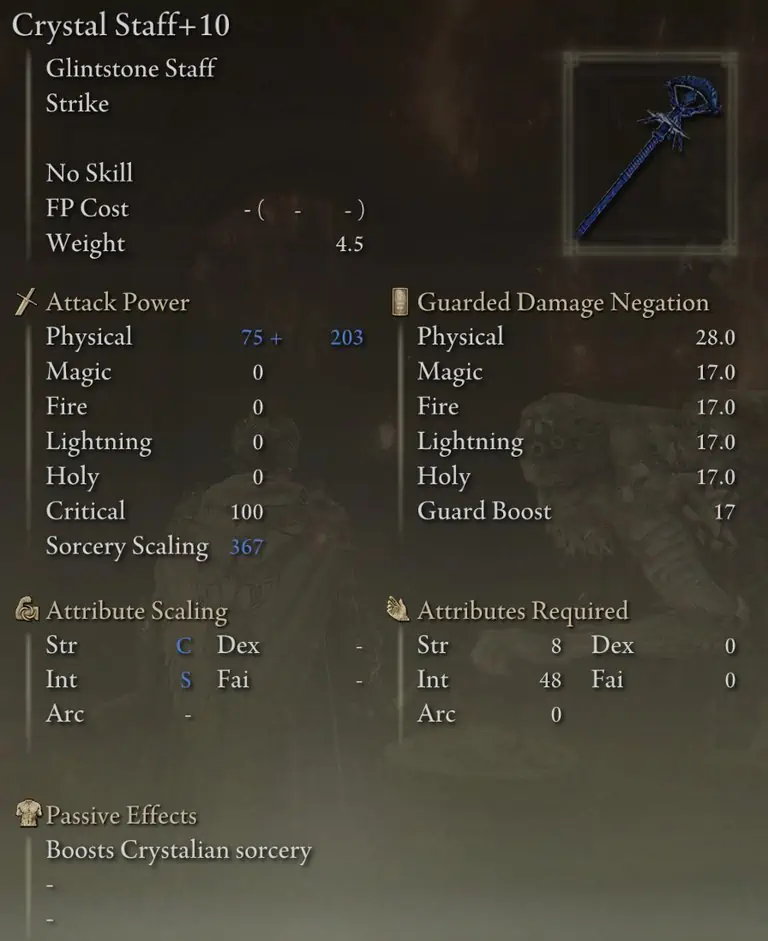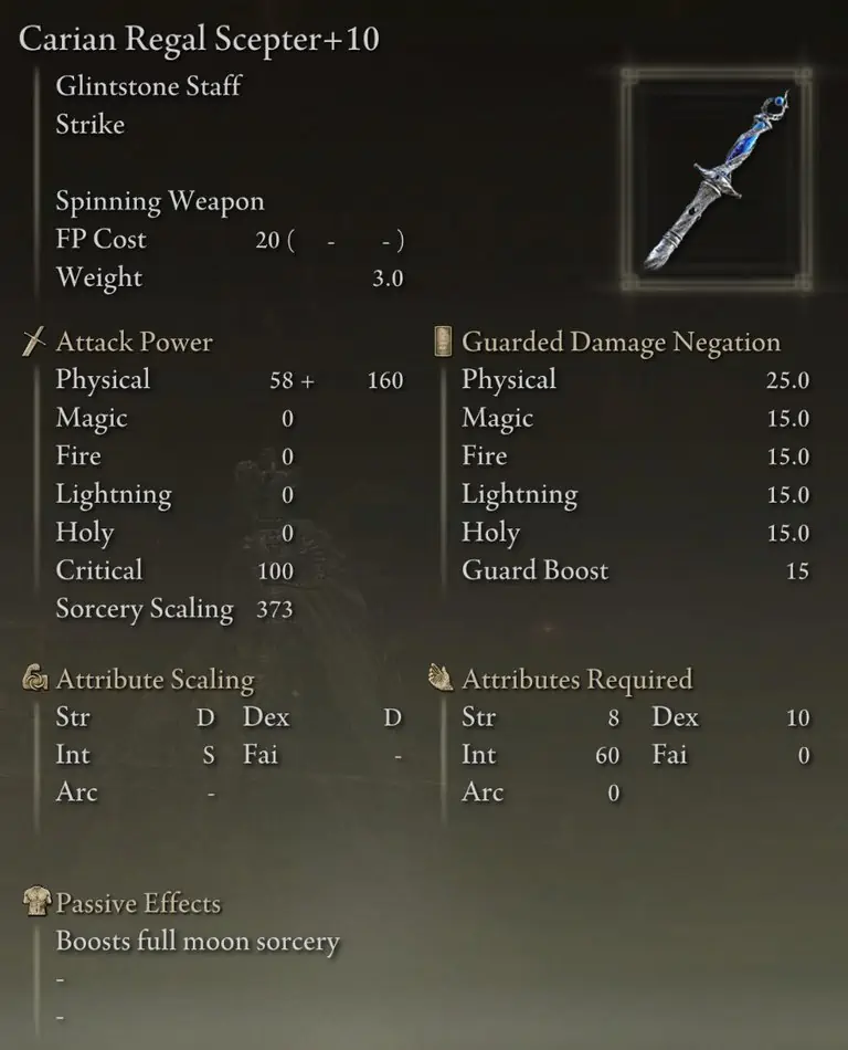 Carian Regal Scepter는 단점 없이 가장 높은 전체 소서리 스케일링을 제공하므로 두 번째로 피해가 큰 스태프가 됩니다. 또한 Rennala의 Full Moon과 Ranni의 Dark Moon이 주는 피해를 증가시킵니다.