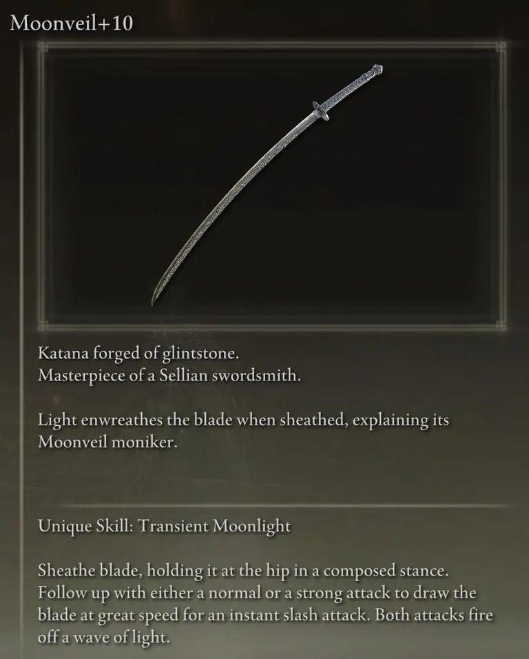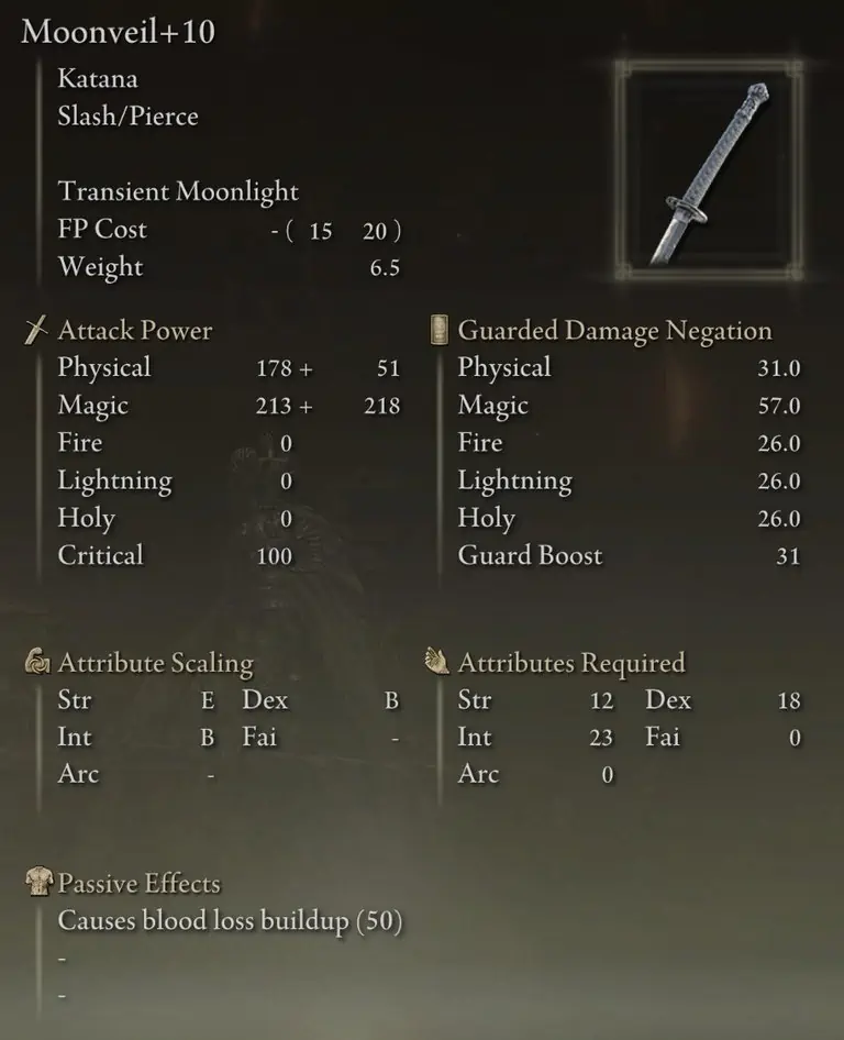 12 Strength와 18 Dexterity는 Moonveil katana를 휘두르는 요구 사항을 기반으로 합니다. 다른 무기를 사용하려는 경우 해당 무기를 대신 사용하기 위한 최소 요구 사항을 충족하도록 이러한 통계를 재할당하십시오. 예를 들어 Dark Moon Greatsword를 사용하려면 16 Strength와 11 Dexterity를 사용하고 싶을 것입니다.