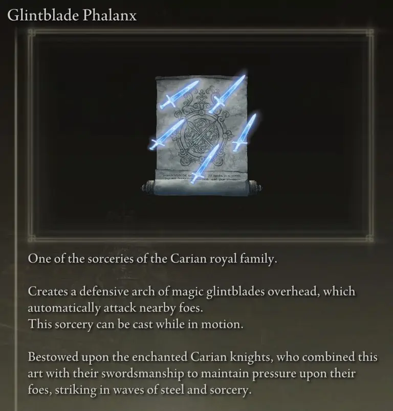 Glintblade Phalanx는 Royal House Scroll을 획득하여 Sorceress Sellen, Miriel, Pstor of Vows(거북 교황), Preceptor Seluvis와 같은 당신에게 마법을 가르칠 수 있는 누군가에게 주고 나서 그들에게서 마법을 구매함으로써 배울 수 있습니다.