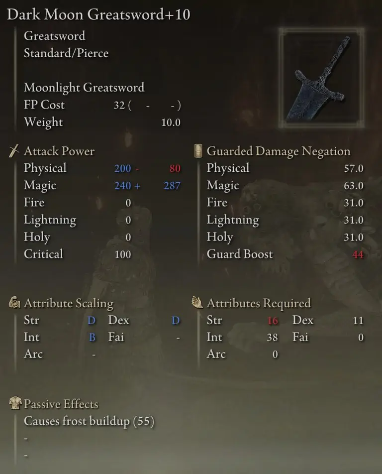 Ranni의 Dark Moon은 타격당 피해량, 범위 및 범위의 3가지 영역에서 강력합니다. 또한 들어오는 주문을 차단하는 기능을 포함하여 몇 가지 고유한 효과를 제공하고 더 많은 피해를 입히는 데 도움이 되는 몇 가지 귀중한 디버프를 적용합니다. 마법 피해 디버프는 적의 특정 마법 무효화를 10% 낮추는 방식으로 작동하므로 적의 마법 저항력이 높을수록 효과가 더 강력하다.