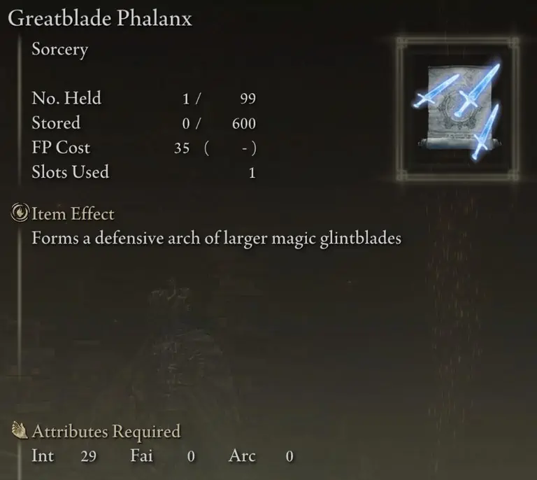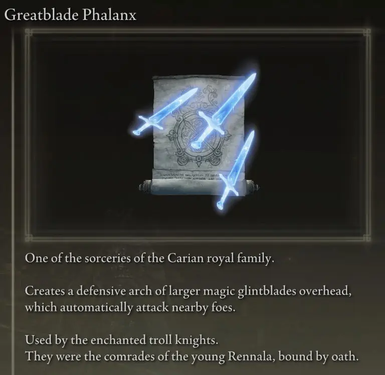 이제 Phalanx 마법에 감사하게 되었으니 어떤 마법을 선택해야 하는지 이야기할 수 있습니다(둘 이상 가질 필요는 없습니다). Carian Phalanx는 어떤 이유로 쓰레기일 뿐이므로 Glintblade와 Greatblade Phalanx 사이에서 선택이 가능하며 어느 것을 사용하기로 선택하느냐는 얼마나 많은 FP를 사용하고 싶은지에 달려 있습니다.
