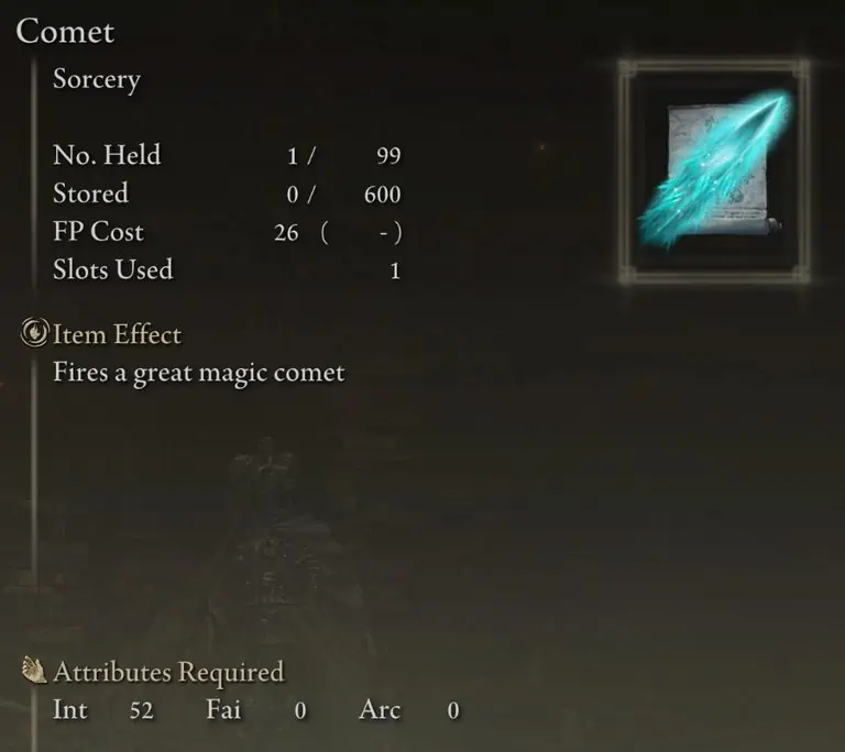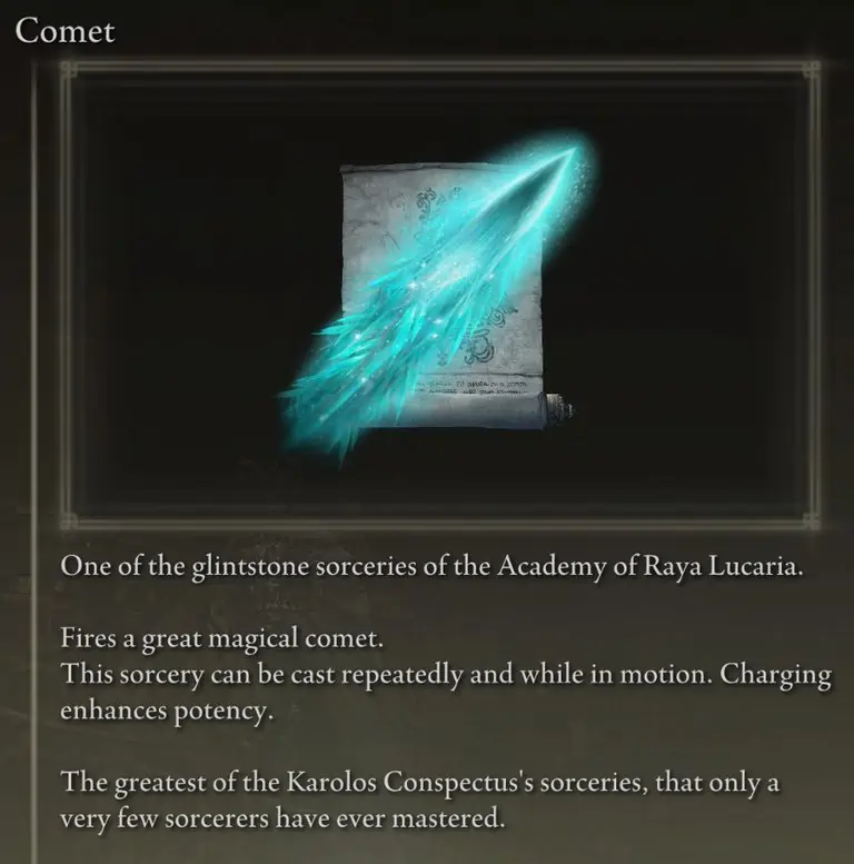 Comet은 Glintstone Shard 시리즈 마법의 가장 강력한 버전입니다. 기본적으로 Dark Souls 시리즈의 Crystal Soul Spear와 동일하지만 Dark Souls와 달리 FP 효율성이 Elden Ring에서 그다지 중요하지 않기 때문에 더 약한 버전을 함께 사용할 필요가 없습니다. FP를 절약하기 위해 Comet과 함께 Glintstone Cometshard를 사용하려고 시도했지만 실제로는 필요하지 않습니다.