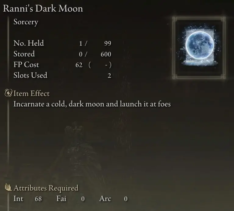 Ranni의 Dark Moon 또는 Rennala의 Full Moon이 더 나은지에 대한 논쟁이 있지만 Ranni의 Dark Moon은 일반적으로 AoE 상황과 관련이 없고 빠르게 만들 수 있는 약간의 피해만 입히기 때문에 훨씬 더 나은 옵션이라고 생각합니다. 적에게 동상을 입히는 데 성공하면 최대.