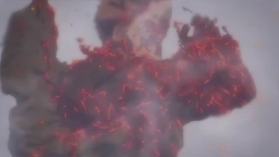 그런 다음 Eren은 전투 중 참호에 표시되고 주위에 죽은 군인이 있습니다. 그는 작은 전투 칼로 왼쪽 다리를 자르면서 입에 천을 넣어 꽉 조입니다. 그런 다음 그는 구멍을 뚫기 전에 큰 구경의 탄약을 눈에 대고 있는 것으로 나타났지만 구멍을 표시하는 대신 화면이 검게 변했습니다.