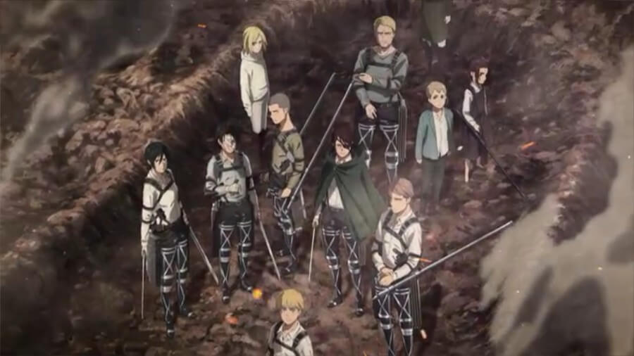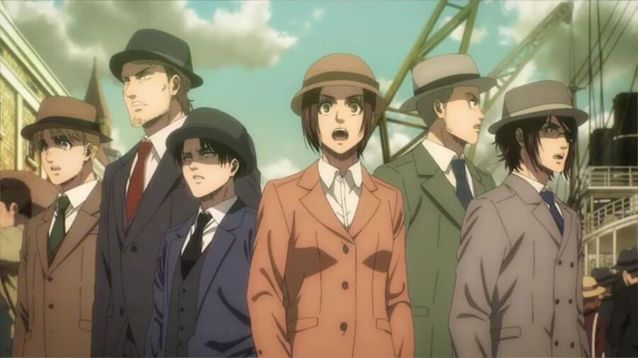 Connie, Jean, Sasha가 배의 갑판에 있었고 벽 너머의 세계에 놀랐을 때 플래시백이 표시됩니다. 진은 코니에게 벽에 대해 너무 시끄럽게 말하지 말라고 말하지만 사샤는 진의 억울함에 자신의 정체를 자랑스럽게 선언합니다. 행은 리바이와 아르민과 함께 측량을 시작하라고 말하면서 옆에 보여진다. 그들은 모두 타이틀 화면이 표시되는 것처럼 호화로운 라이너로 보이는 것에 어울리는 옷을 입고 있습니다.