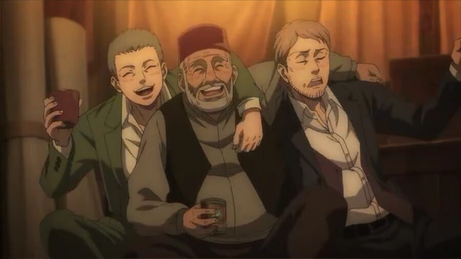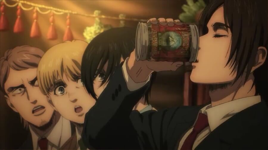 그는 Eren에게 약간의 보드카(아마도)를 따르고 Eren은 그것을 한 번에 마신다. 다른 사람들은 Eren의 모범을 따라 술을 마셨습니다. 유쾌하고 술 취한 잔치의 장면. 술이 떨어지면 진영 전체가 함께 모여 그들이 직면한 억압의 바다에서 하나의 큰 행복한 잔치를 벌인다. Levi, Hange, Onyankopon은 한밤중에 나머지 일행을 찾아와 모두가 의식을 잃었고 뒤에 있는 한 사람도 구토를 하는 것을 목격했습니다!