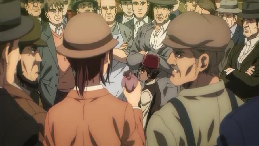 그런 다음 리바이는 주변의 말리 사람들이 이민자들을 범죄로 비난하기 시작하자 사샤의 지갑을 훔친 소매치기를 잡고 있는 것으로 나타납니다. Marleyans는 그를 바다에 던질지 아니면 그의 오른손을 부수는지 토론합니다. 다른 사람은 그를 묶어서 모두가 볼 수 있게 하라고 말합니다. 사샤는 너무 멀고 이미 지갑이 있다고 말하지만 그들은 그녀를 무시합니다. 그들은 그녀에게 그곳에서 생계를 유지하는 상인으로서 모범을 보여야 한다고 말합니다. 유미르의 신하일 수도 있고 " 이 악마의 피가 근처에 도사리고 있다"는 걸 알면서도 잠을 잘 수 없다고 한다.