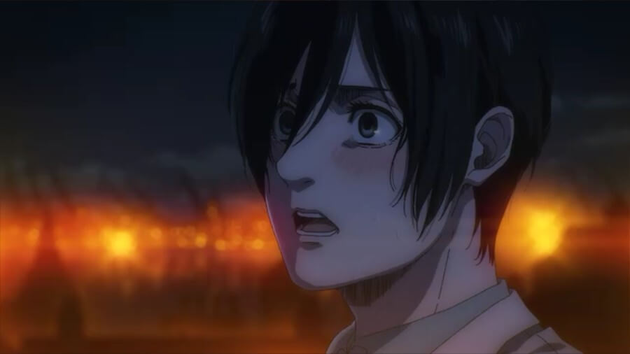 에렌의 질문에 충격을 받은 미카사 (이미지 출처: MAPPA Co., Ltd.) .