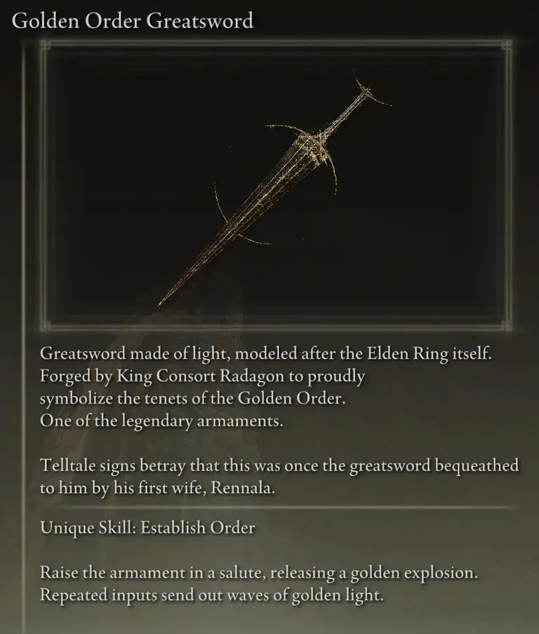The Golden Order Greatsword는 거인의 산꼭대기 서쪽 지역(Haligtree 쪽)에 있는 고독의 동굴 끝에서 Misbegotten Crusader 보스를 물리치고 떨어집니다.