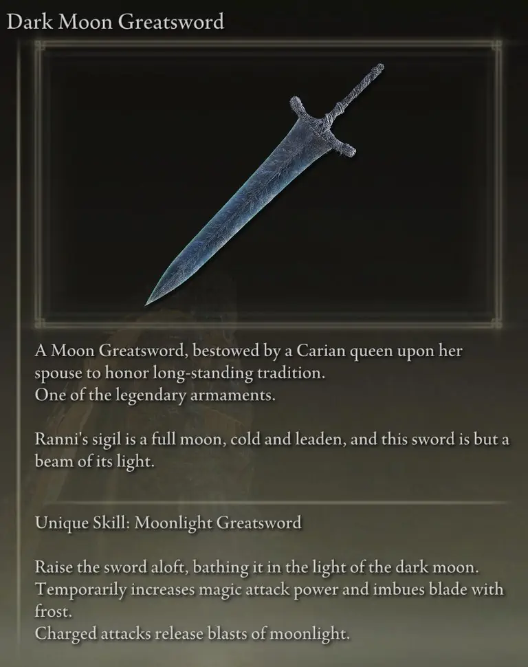 다크 문 대검은 리우르니아 남서부의 월광 제단 고원에 있는 마누스 셀레스 대성당 아래 동굴에 있습니다. 마녀 란니의 퀘스트 완료 보상입니다 .
