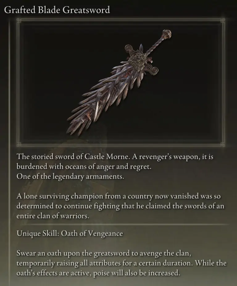 Legendary Armaments가 반드시 게임에서 가장 강력한 것은 아니며 대부분은 현재 빌드에서 사용할 수 없을 것입니다. 모든 Legendary Armaments에는 몇 가지 공통된 특성이 있습니다. 가장 주목할만한 점은 모두 고유 스킬을 가지고 있으므로 Ashes of War를 사용하여 친화도/스케일링 또는 스킬을 변경할 수 없다는 것입니다. 그들은 또한 휘두르는 데 약간 또는 더 높은 스탯 요구 사항을 갖는 경향이 있으며 상당한 비율이 그레이트소드입니다.
