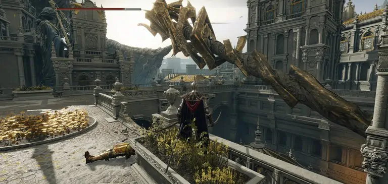 그란색스의 볼트에 도달하려면 난간으로 내려가 더 큰 볼트 위로 걸어나와야 합니다. 아래 이미지는 Erdtree Sanctuary 서쪽 입구 근처 리프트에서 본 모습입니다(오른쪽은 거대한 Radagon의 동상입니다.