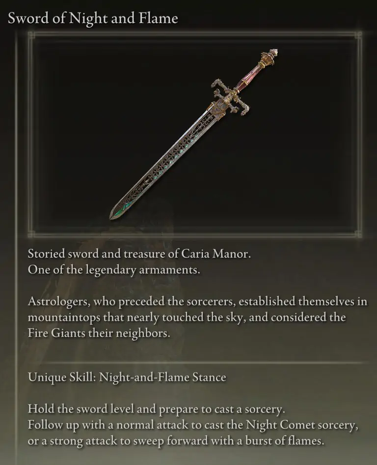 밤과 불꽃의 검(Sword of Night and Flame)은 리우르니아(Liurnia) 북서쪽에 있는 카리아 저택( Caria Manor )의 낮은 안뜰 중앙 근처에 있는 방에서 발견되는 상자에 있습니다 .