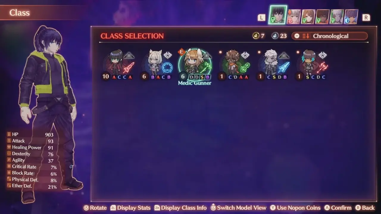 메뉴 아이콘을 누르고 드롭다운에서 캐릭터를 선택합니다. 다음으로, 주어진 선택에서 " 클래스 " 옵션을 선택하십시오. 각 캐릭터의 클래스 정보에 대한 차트에 접근하기 위해서는 ZR 버튼을 사용해야 합니다.