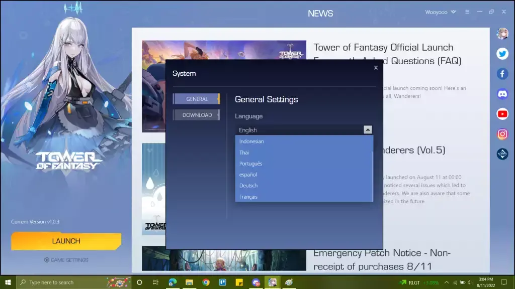 이 외에 런처에서 Tower of Fantasy의 언어를 변경하려면 다음 단계를 수행하면 됩니다.