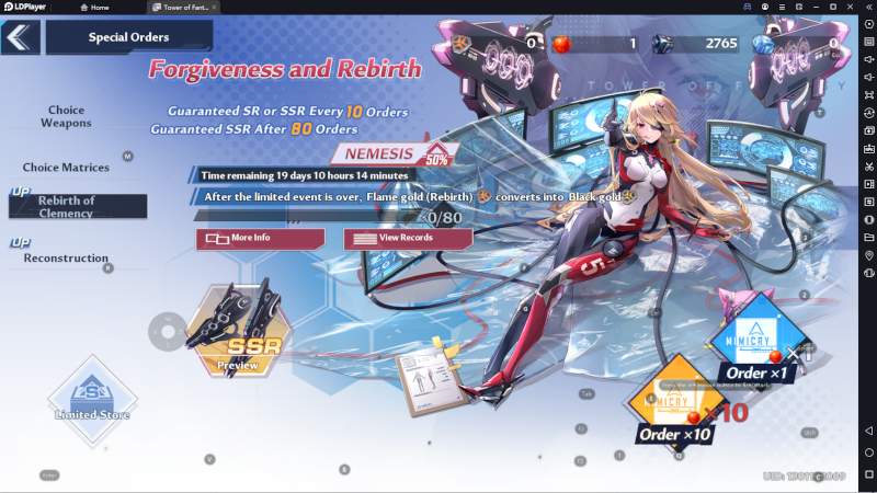 " Rebirth of Clemency" 배너는 Tower Of Fantasy 의 "Rate-Up" 배너입니다 . 이 배너에서는 Red Nucleus 로만 소환할 수 있으며 , Red Nucleus 는 게임팩/리얼 머니 또는 다크 크리스탈 교환 (150x 1 Red) 으로 만 얻을 수 있습니다 . 그것은 거의 무기 만 제공하지만 배터리 (Exp Material) 를 얻을 수있는 작은 기회도 있습니다 . Red Nucleus 는 희귀 화폐이며, Rate-Up Banner는 보통 2~3주 동안 지속됩니다. 종료 전에 불쌍히 여기지 않으면 모든 플레임 골드(환생) 화폐가 블랙골드 화폐 로 전환됩니다., 따라서 현명하게 당길 계획을 세우십시오. 요금은 다음과 같습니다.