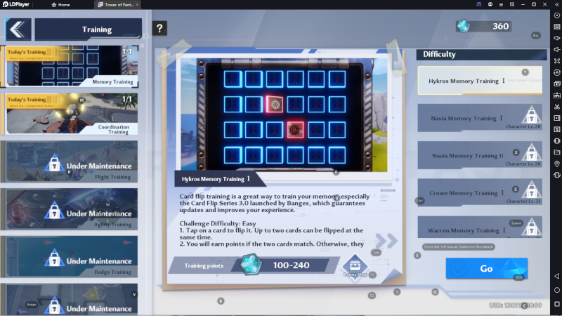 " 트레이닝" 은 배틀 몬스터, 플라잉 인 서클, 달리기 등과 같은 "미니 게임" 을 플레이 하는 일일 콘텐츠 입니다. 이러한 미니 게임의 점수가 빠르고 높을수록 더 좋은 보상을 받을 수 있습니다. 훈련 포인트 를 사용 하면 무기 및 매트릭스 경험치 아이템을 얻을 수 있지만 기본적으로 무기의 강력한 패시브 능력을 잠금 해제하기 위한 선물 도 얻을 수 있습니다.