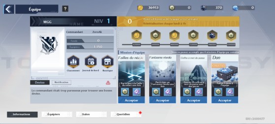 - 팀 퀘스트 : 길드원과 함께 다양한 미션에 참여하세요. 그것들은 실현되기 전에 받아들여져야 합니다. 이를 완료하면 팀을 위한 성과와 자금을 얻을 수 있습니다. 매주 회원당 4개의 미션만 수행해야 합니다.