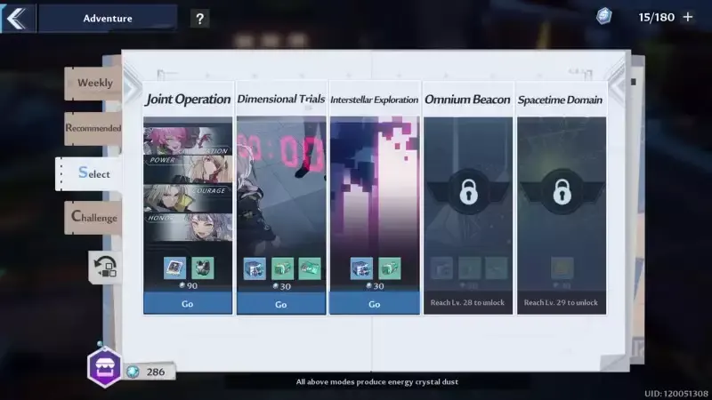 활력을 사용하려면 같은 모험 메뉴 화면에 있는 작전에 참여해야 합니다. 합동 작전, 성간 탐사, 차원 시험, 옴니엄 비컨, 시공간 영역의 5가지 작전이 있습니다. 합동 작전은 방랑자가 90 활력을 소비하는 반면 나머지는 30포인트가 필요합니다.