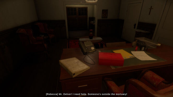 들것과 함께 냉장보관(영안실)으로 이동하여 원하는 시신을 꺼냅니다. 그것을 방부 처리실로 다시 가져와서 눈에 띄는 것이 있는지 시체를 조사하면 악마를 목격하게 될 것입니다. 지금 떠나려는 시도는 소용이 없을 것입니다. 악마는 단순히 당신이 직장으로 돌아가도록 설득할 것입니다.