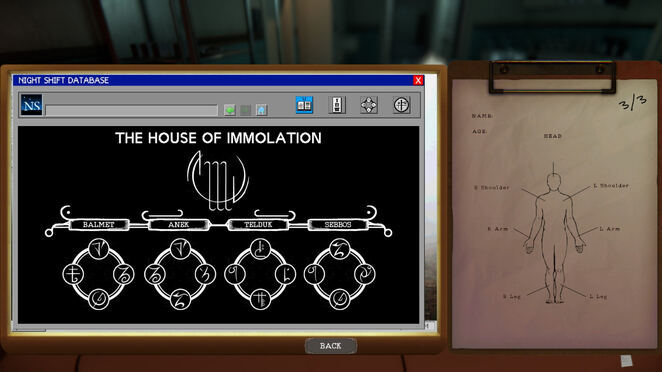 세 번째 시체를 준비하고 리셉션으로 이어지는 문의 오른쪽 서랍을 확인하십시오.미스터 델버의 액세스 카드그리고 뒷면을 보고 "Night Shift" 암호를 알아내십시오. 컴퓨터에서 "Night Shift"를 클릭하고 암호를 입력한 다음 "Sigils of Demonic Names"를 클릭하고 발견한 4개의 인장을 찾으십시오. (여기서 스크린샷이 도움이 될 수 있습니다.)