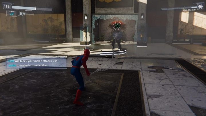 전투가 끝나면 Fisk로 이어지는 문을 파괴하고 계속 진행하십시오. R2를 누르고 스틱을 움직여 앞으로 나아가면 Peter가 더 나아가기 위해 파쿠르 기술을 사용할 수 있습니다. 다시 한 번 적군을 만나 빠르게 처리하고 계속 이동합니다. 이번에는 경찰로 분장한 악당을 만나 전투 방패를 사용할 새로운 유형의 적과 싸우게 됩니다. 이 상대 유형은 전방의 모든 공격을 차단하고 컨트롤러의 원형 버튼을 눌러 다리 아래로 이동하여 후방에서 안전하게 공격합니다.
