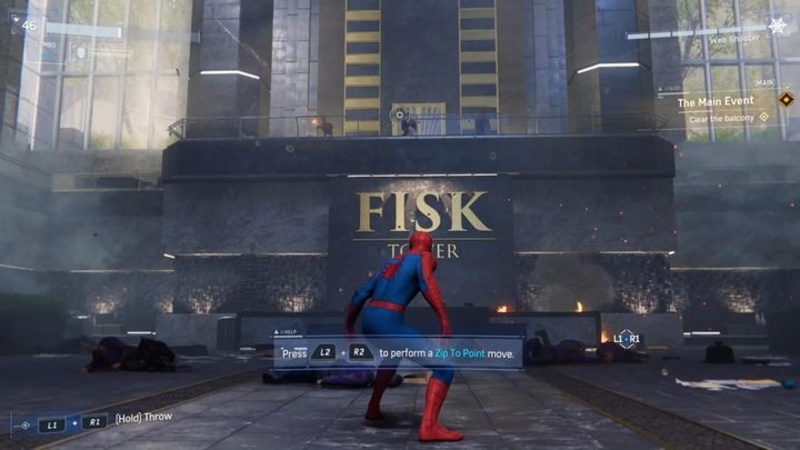 싸움이 끝난 후 빨간 문으로 달려가면 결국 일어난 모든 일의 책임자인 마피아 보스인 윌슨 피스크(Wilson Fisk)에게 도달하게 됩니다. 전투의 첫 번째 단계는 포탑을 파괴하는 것입니다. 무거운 소총 사격을 피하고 L1 + R1을 사용하여 포탑을 빼앗아 보스에게 발사하십시오. 이 동작을 여러 번 반복하면 전투의 두 번째 단계가 시작됩니다.