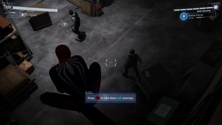 처음에는 스파이더맨이 들키지 않은 채로 남아 있으며 적을 기절시켜 하나씩 제거할 수 있습니다. 강조 표시된 적 옆에는 위험과 같은 텍스트가 있습니다. 이것은 이 적에게 기절을 가하면 주변 적에게 경고할 것임을 의미합니다. 즉, 고독한 목표물을 사냥하거나 도적을 한적한 곳으로 유인해야 합니다.