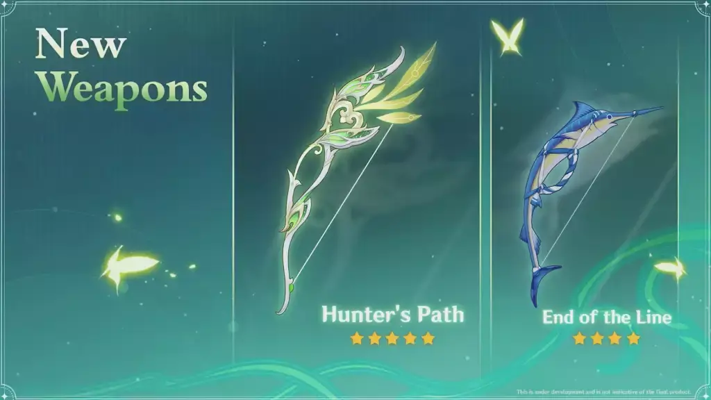 반면에 4성 End of the Line 활 무기는 황새치 디자인을 가지고 있으며, Kamisato Ayato 또는 Sanganomiya Kokomi와 같은 Hydro 활 사용자를 대상으로 할 수 있습니다 .