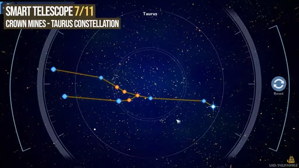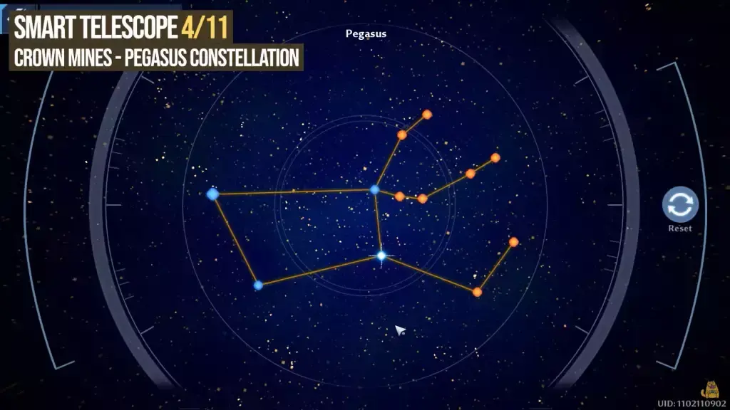 스마트 망원경을 찾으면 즉시 별자리 퍼즐을 풀 수 있습니다. 퍼즐을 풀려면 파란색과 주황색 점을 연결하기만 하면 됩니다. 별자리를 완성하면 주황색으로 바뀝니다. 이 퍼즐은 시간 기반이 아니므로 실수할 경우 언제든지 퍼즐을 재설정할 수 있습니다.