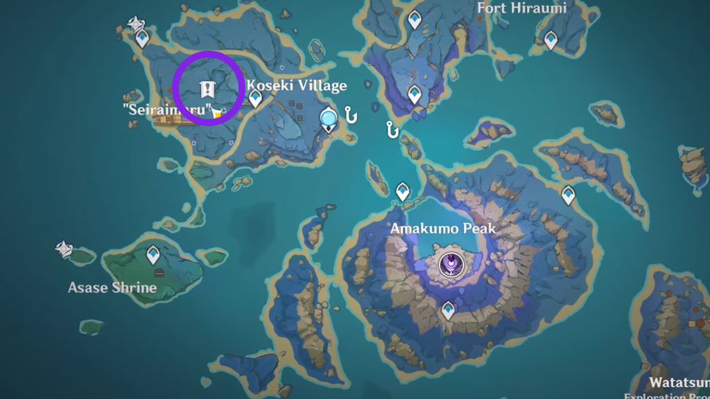 세이라이마루는 고세키 섬의 서쪽에 있습니다. 당신은 언덕 꼭대기에서 그곳으로 순간이동할 것입니다. 언덕의 왼쪽에는 멀리 신사가 보입니다. 거기에 도달하여 열쇠로 잠금을 해제하십시오. 자원을 수집하십시오.