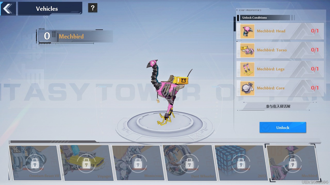 나머지 7개 차량 중 5개는 차량을 구성하는 다양한 구성 요소를 수집해야 합니다. 그런 다음 이를 조합하여 장비하고 이동할 수 있는 완전한 차량을 만들 수 있습니다. 이 5개 차량의 구성 요소 중 4개는 세계 탐험을 통해 발견되는 반면 Mechbird는 아래에서 설명할 특별 출시 이벤트 중 하나와 관련이 있습니다.