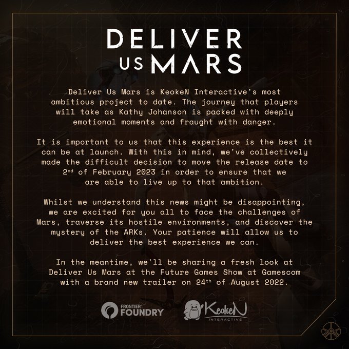 SF 어드벤처 게임 Deliver Us Mars 가 2023년 2월 2일로 연기된 Hogwarts Legacy 에 합류했습니다 . 원래 다음 달 PS5, PS4로 출시될 예정이었던 스튜디오 KeokeN Interactive는 제목이 "The 출시 시점에 최선을 다할 것"이므로 "그 야망에 부응하기 위해" 더 많은 시간이 필요합니다. Gamescom 2022 의 일환으로 다음 주 Future Games Show에 새로운 예고편이 포함될 예정입니다 .