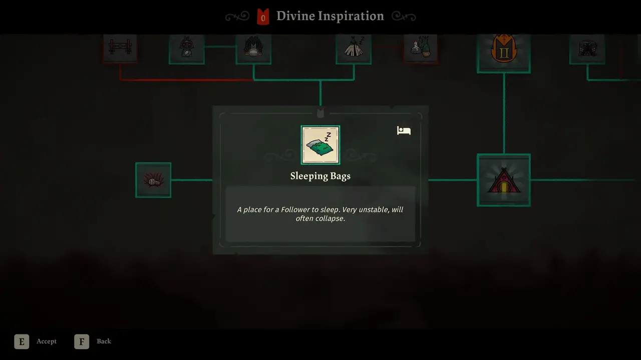 당신이 지금 소유하고 있는 힘이 증가했을 때만, 당신이 취해야 할 가장 첫 번째 단계는 당신의 모든 추종자들에게 충분한 침낭이 있는지 확인하는 것입니다. 이 시점에서 아마 5~6개를 획득할 것입니다. 정확한 숫자는 첫 번째 탐험 중에 어느 거점으로 이동했는지에 따라 달라집니다.