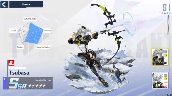 츠바사는 Icewind Arrow라는 얼음 활을 휘두르는 SSR Simulacra입니다. 중력과 바람의 힘을 겨루는 뛰어난 궁수다.