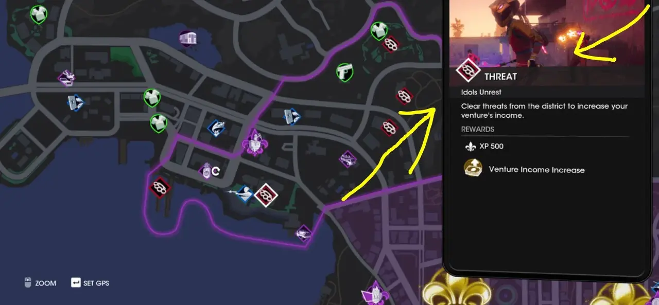 Saint Ileso의 각 지역에서 약 5개의 위협 을 만들 수 있습니다. 이들 중 대부분은 어딘가에 가서 무언가를 죽이는 것과 관련이 있지만 때때로 라이벌 갱단에서 은닉물을 훔치는 경우가 있습니다. 위협을 하기 전에 해당 지역에 범죄 모험가가 있어야 합니다.