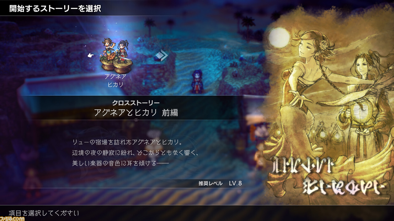 - 태어난 곳도, 여행의 목적도, 그리고 특기도 다른, 새로운 8명의 여행자들로부터 1명을 주인공으로 선택해, 모험에 떠나자.