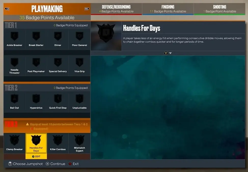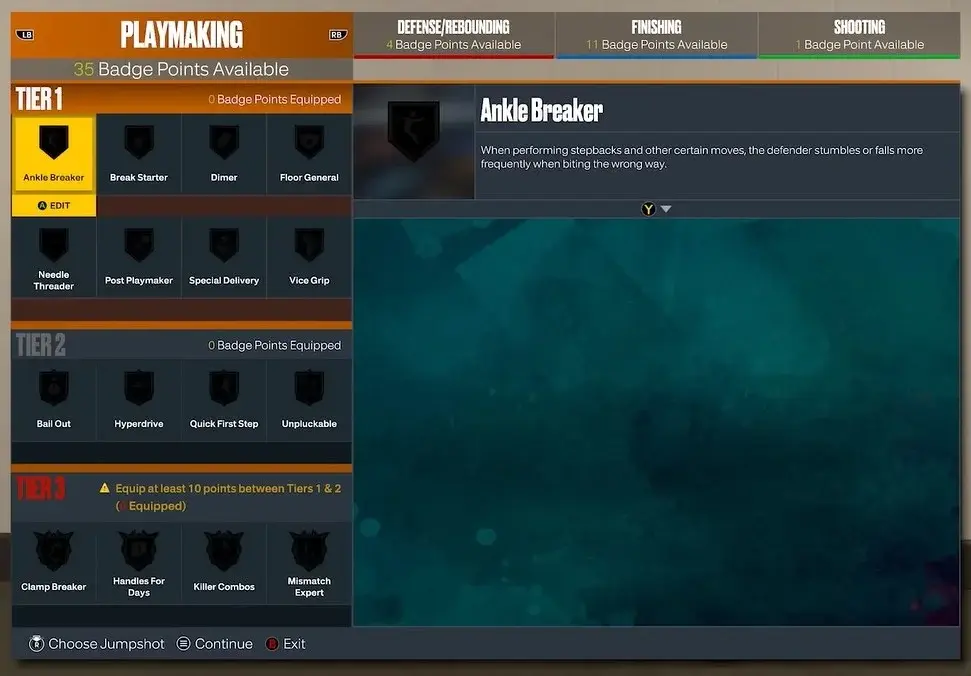 따라서 Honorable Mentions 섹션의 첫 번째 선택은 ' Clamp Breaker ' 배지(Tier 3)입니다. 이 배지를 장착하면 볼 핸들러로서 플레이어의 접촉 방지, 볼 보호, 상대 드라이브 능력이 향상됩니다.