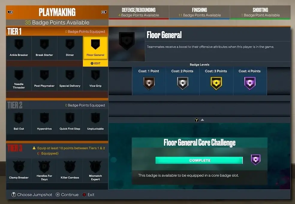 Tier 1 및 2 배지를 즉시 잠금 해제할 수 있지만 Tier 3에서 배지를 잠금 해제하려면 먼저 관련 배지 포인트 10개 이상을 사용해야 합니다. 이제 플레이메이킹 배지의 기본 사항에 익숙해졌으므로 NBA 2K23에서 최고의 배지를 나열할 수 있습니다.