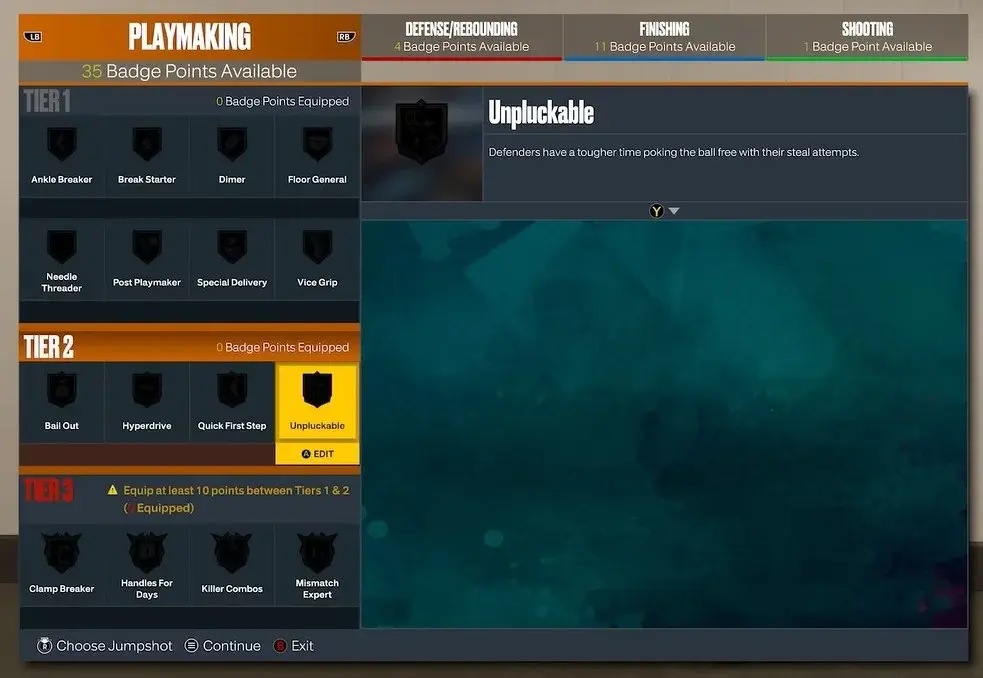 Ankle Breaker 및 Floor General과 같은 배지를 얻는 것 외에도 보관함에는 Unpluckable과 같은 배지가 있어야 합니다. 상대 수비수가 당신의 선수에게서 공을 훔치는 것을 더 어렵게 만들 것입니다. 만약 그것을 가지고 있지 않다면, 당신은 종종 당신의 선수가 소유권을 포기하는 것을 보게 될 것이고 이는 코트에서 반격으로 이어집니다.