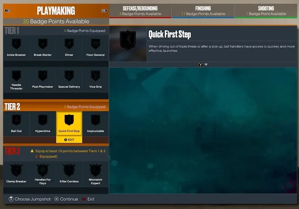 Tier 2 배지의 또 다른 항목은 Quick First Step입니다. 이렇게 하면 상대를 훨씬 쉽게 지나칠 수 있으므로 특히 드리블러를 위한 NBA 2K23 최고의 플레이메이킹 배지 중 하나가 됩니다. 빠른 첫 단계 배지는 속도 버스트가 포함된 드리블 동작에 매우 적합합니다. 플레이어는 상대 가드를 때릴 때 더 민첩하게 느낄 것입니다.