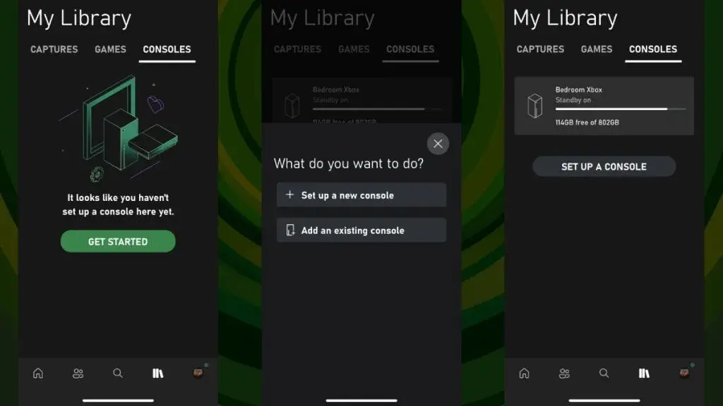 - 이렇게 하려면 라이브러리 탭(하단 프로필 옆에 있는 아이콘)으로 이동하여 "콘솔 설정"을 클릭합니다. 콘솔이 등록되지 않은 경우 먼저 "시작하기"를 탭해야 합니다.