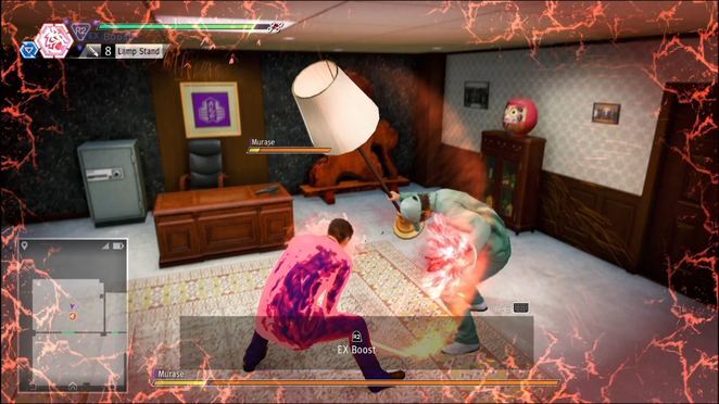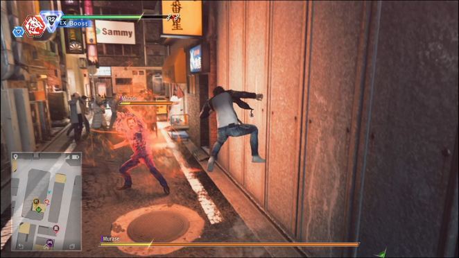 EX 게이지가 하나 이상 충전되어 있으면 R2를 눌러 EX 부스트에 들어갑니다. 이 임시 특수 상태는 Yagami의 전반적인 능력을 향상시키고 특수 EX 액션에 대한 액세스를 제공합니다. 이 모드에서는 EX 게이지가 서서히 소진됩니다. EX 게이지가 비면 야가미는 정상으로 돌아갑니다. 게이지를 절약하기 위해 R2를 눌러 EX 부스트를 자유롭게 취소할 수 있습니다.