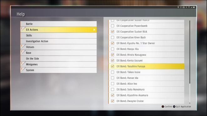 사용 가능한 EX 본드 액션과 트리거 방법을 확인하려면 스마트폰에 액세스하고(컨트롤러의 옵션 버튼 누르기) 도움말로 이동한 다음 아래와 같이 EX 액션으로 이동합니다. 원을 눌러 EX Action을 열어 설명, 조건, 그리고 어떤 일이 발생해야 하는지에 대한 짧은 비디오 클립까지 볼 수 있습니다.