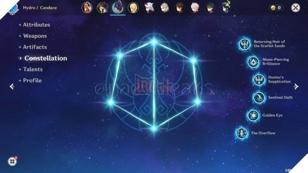 현재 전투 중인 캐릭터가 Red Crown Blessing 상태(Candace 자신 제외)에 있을 때 일반 공격이 원소 피해를 주는 적에게 명중하면 Shock Tide를 시전하여 범위 피해를 입힙니다. 물 원소는 15% 캔디스의 HP 한계. 이 효과는 2.3초마다 1회 발동되며, 입힌 피해는 분노 스킬 피해로 계산됩니다.