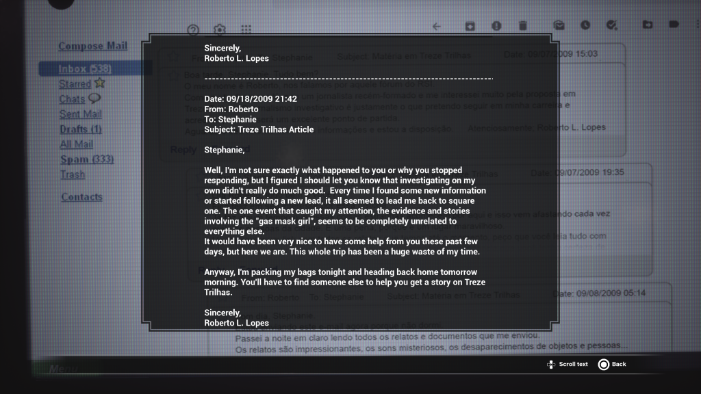 당신은 Treze Trilhas, 특히 St. Dinfna Hotel에서 이상한 일이 일어나고 있다는 소식을 들은 떠오르는 저널리스트 로베르토로 플레이합니다. 일주일이 지나면 막다른 골목처럼 보이지만 일이 시작되어 그는 방에 갇히고 개인 욕실에 포털이 잠시 나타납니다. 그때가 바로 게임이 시작되는 때입니다. 방에서 나갈 방법을 찾아야 하고 환경적 단서를 사용하여 자물쇠를 열고 다른 지역의 퍼즐을 푸는 데 도움이 되는 아이템을 수집해야 합니다.