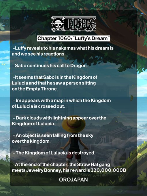 초기 유출에 따르면 원피스 1060화의 제목은 "루피의 꿈"이며 이름에서 알 수 있듯이 루피가 자신의 꿈에 대해 승무원에게 밝히고 우리는 그들의 반응을 보게됩니다. 챕터는 Strawhats에 초점을 맞추는 한편 Sabo는 Dragon과 통화하는 것을 볼 수 있습니다. 그는 루루시아 왕국에 있을 때 빈 왕좌에 앉아 있는 사람을 보았다고 언급합니다.