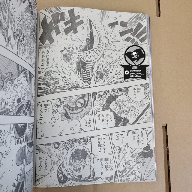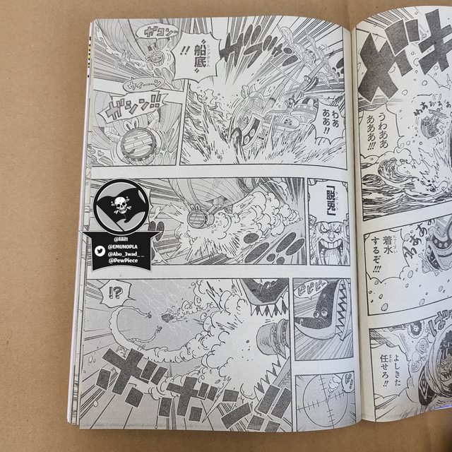루피는 다른 사람들과 함께 물에 빠지고 문제가 발생하고, 사우전드 써니는 뒤집힌다. 징베는 과일 세 개를 구하기 위해 출발하고 나머지는 배 가까이에 있으려고 합니다. 거대한 Franky 로봇이 개입하여 위협을 저지하고 배를 수리하기까지 했을 때 상어가 생존자들을 공격하려고 합니다 .