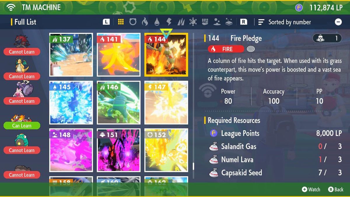 TM 또는 레시피를 획득하면 모든 포켓몬 센터의 TM 기계에서 제작할 수 있습니다. 각 TM에는 고유한 필수 리소스가 있습니다. TM 레시피가 있는 경우 페이지에서 필요한 재료를 명확하게 볼 수 있습니다. 첫째, 모든 TM에는 체육관 전투 및 Tera Raid 전투에서 부여되는 리그 포인트가 필요합니다.