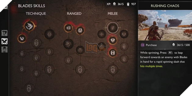 적에게 접근하여 처리하는 것을 좋아하는 사람들에게는 강력할 뿐만 아니라 Kratos 가 적에게 빠르게 도달하는 데 도움이 되기 때문에 Melee 분기 의 Rushing Chaos 가 최우선 순위입니다. 그것을 사용하기 위해 플레이어는 단순히 앞으로 가속한 다음 R1 버튼을 누르고 있으면 Kratos 가 적을 향해 점프하여 적을 여러 번 공격하는 강력한 회전 공격을 펼칠 수 있습니다.